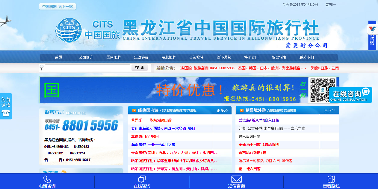 黑龙江省中国国际旅行社有限责任公司哈尔滨会展中心营业部 ,为哈尔滨市旅游局下属国营企业,2002年晋升为全国528家出境组团社之一,现有员工130人,在哈尔滨市设有3个分社,在省内黑河、鸡西、牡丹江、通河设有4个分社。在石家庄、天津、济南、广州、等16个省会城市办事处。与此同时在省内和省外的业务正在有序的扩大进行着。黑龙江省中国国际旅行社有限责任公司哈尔滨会展中心营业部 连续多次荣获哈尔滨市“旅游冰雪节杯优质服务竞赛”标兵单位,1997年多次被哈尔滨市旅游局命名为“十佳旅行社”,共青团黑龙江省委命名为:“青年文明号”单位,1998年8月份,经共青团黑龙江省委和黑龙江省旅游局推荐、评审我社是黑龙江唯一家被团中央、国家旅游局命名为全国旅游系统“青年文明号”此荣誉一直保持至今。我社首家推出“自由人”,收到了良好的社会回报。